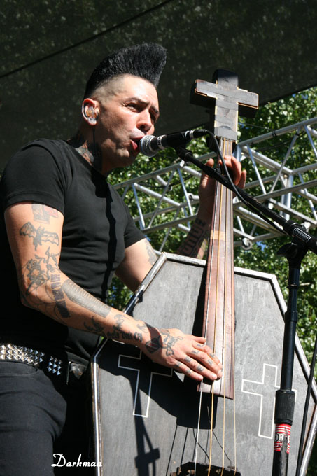 At this time the psychobilly scene was dominated by brit bands, and psychobilly fans world-wide welcomed the new and different style of Nekromantix. The music is described as being like “Elvis meets the Wolfman”, add a little punk attitude and spice it up with monster movies lyrics. Kim’s wildness on stage and his well known coffin bass have proven that likes to have fun with the music.